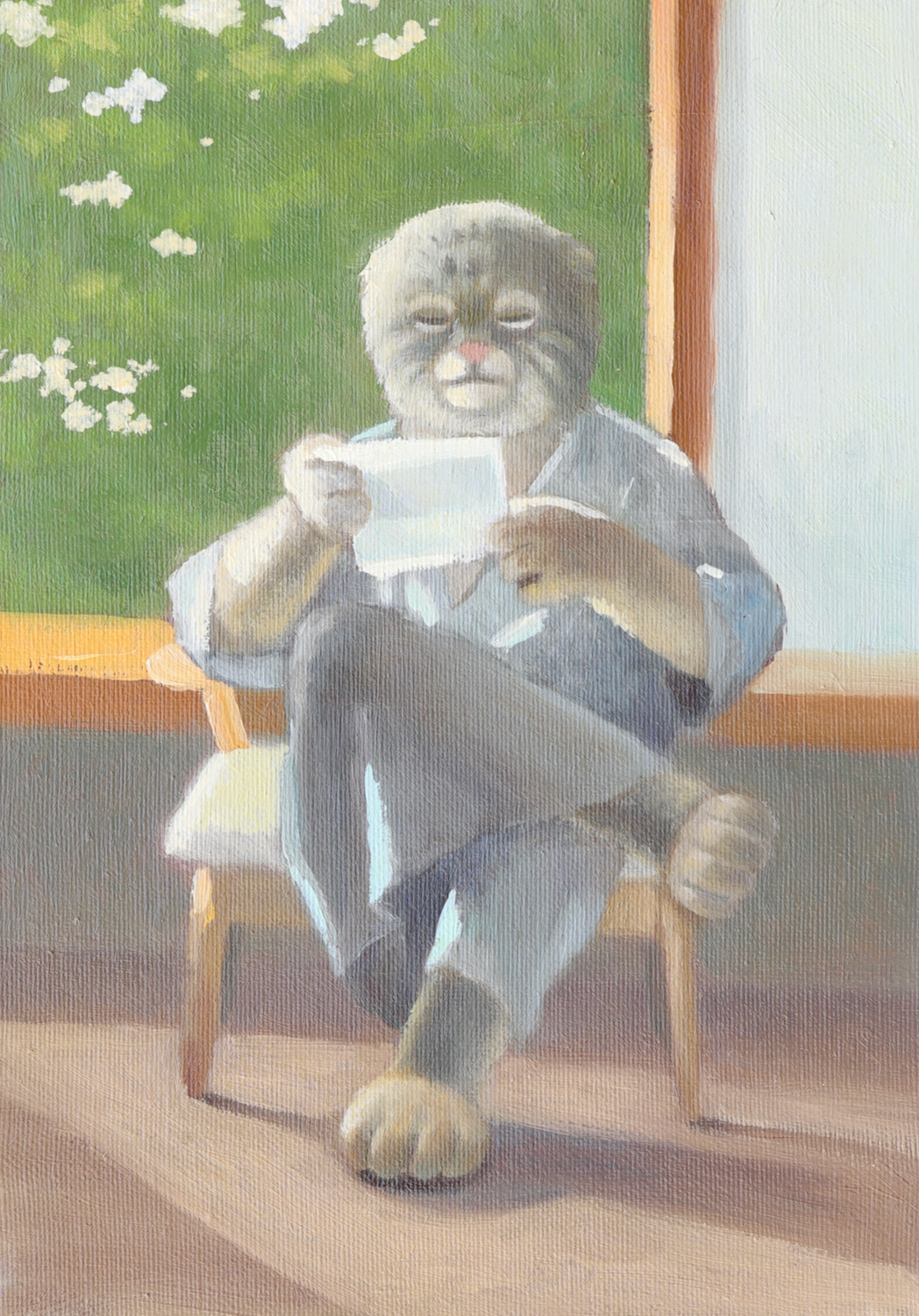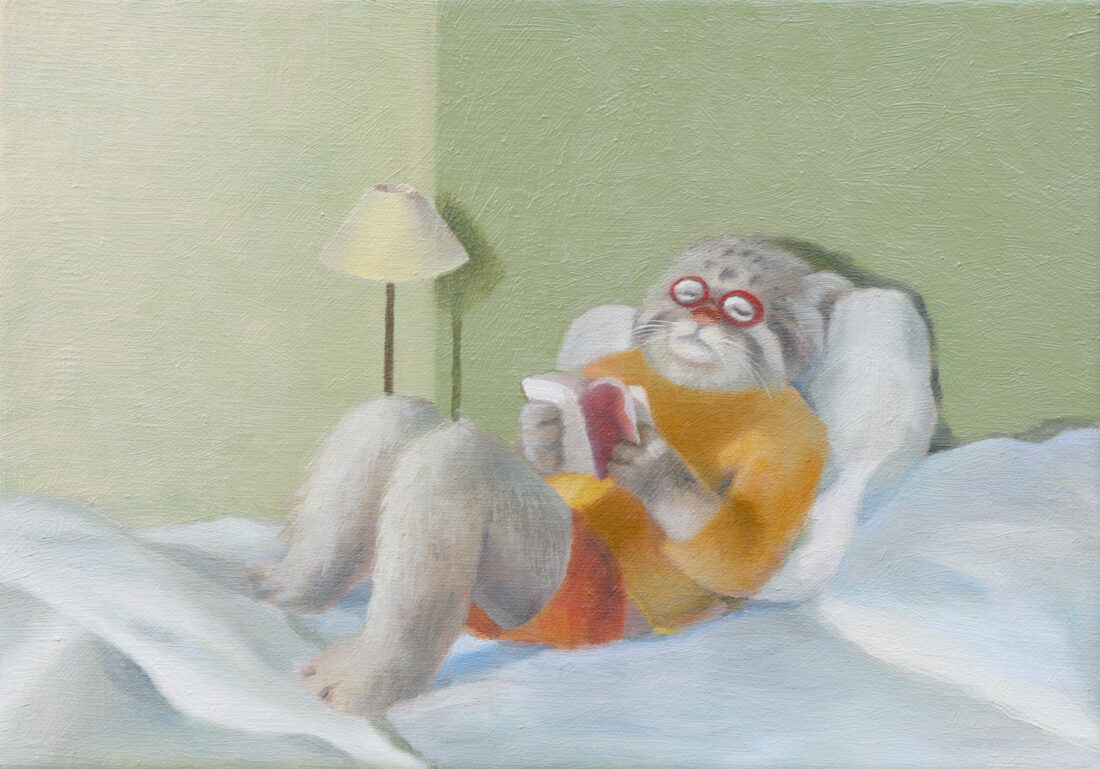 4 pm Reading n° 2 Cat, for sale, Picture, Small format Year 2025 Size 21 x 30 cm Price For sale Technique Oil on canvas Refrence number 754 Contact ✖ Δ